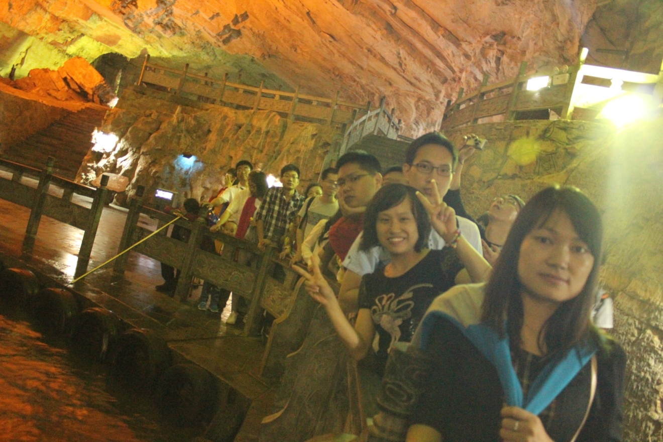 最后我們來到張家界的著名景觀——黃龍洞,在入洞門口,我們看到排隊參觀的游客已經(jīng)排成了一條很長的隊伍,可見黃龍洞是來張家界旅游的必經(jīng)之地,聲譽自認(rèn)也是眾所周知,隨后我們進(jìn)洞了,在各種燈光的照射下,七彩斑斕,我們好像進(jìn)入了童話世界,隨著導(dǎo)游我們上了三百多臺階,崎嶇的臺階兩旁是奇形怪狀的石壁,石筍,石松,原本單調(diào)的石筍在燈光下也變的那么美麗,不知不覺,我們來到了龍宮,看到了定海神針,龍王的火箭,以及被燈光裝飾的龍王,看起來栩栩如生,居高臨下,眾多石柱石筍似人似物,維妙維肖,圍著寶座朝拜山呼,幾十座珊瑚亭亭玉立,儼然一支龐大的“宮廷樂隊。