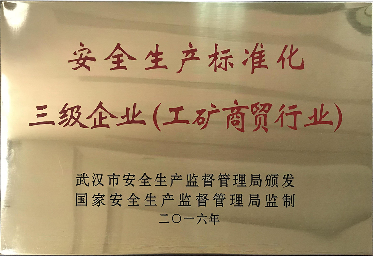• 安全生產(chǎn)標(biāo)準(zhǔn)化 頒發(fā)時間:2016年 頒發(fā)單位:武漢市安全生產(chǎn)監(jiān)督管理局