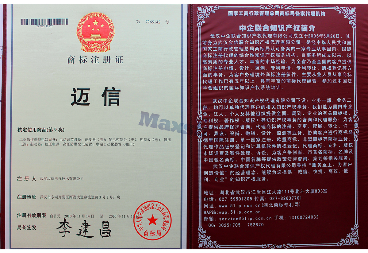 • “邁信”商標(biāo)成功注冊 頒發(fā)時間:2010年12月 頒發(fā)單位:國家工商行政管理總局