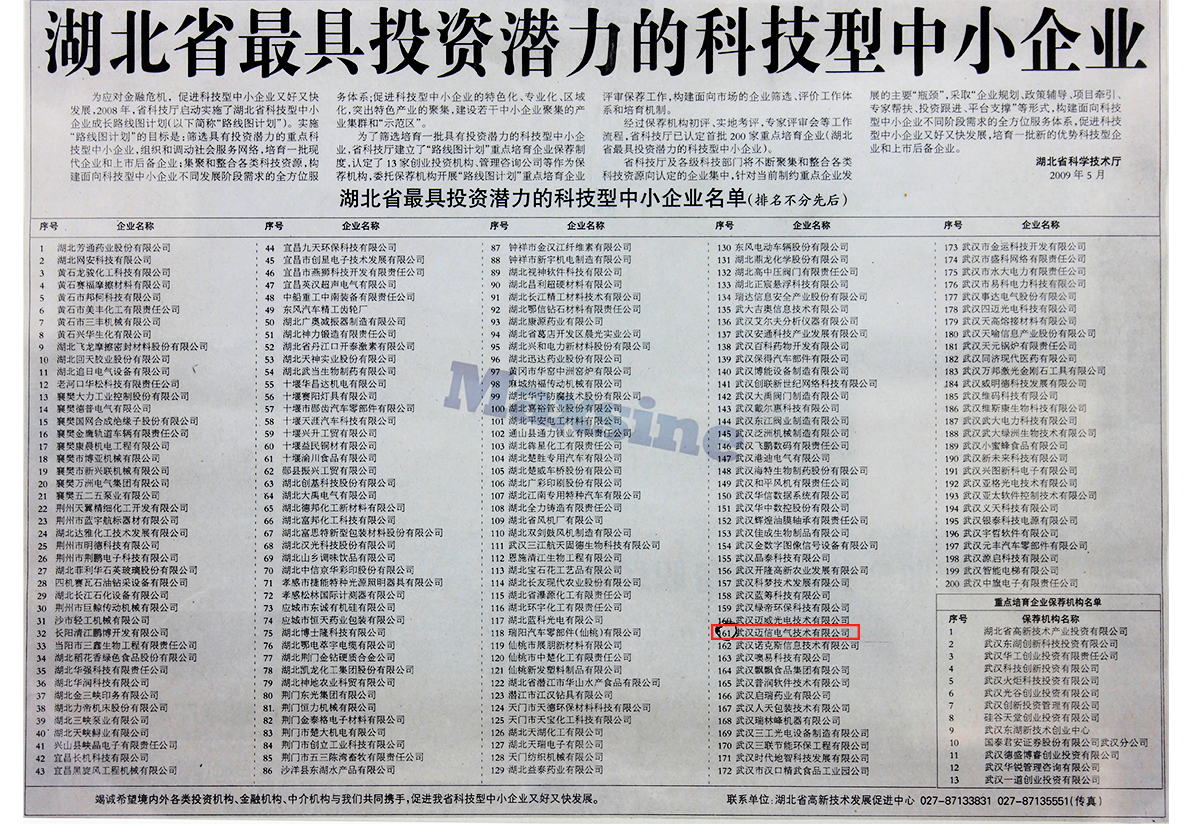• 湖北省最具投資潛力的科技型中小企業(yè) 頒發(fā)時間:2009年5月 頒發(fā)單位:湖北省科學(xué)技術(shù)廳