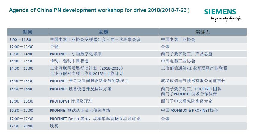 2018年7月23日~24日,中國電器工業(yè)協(xié)會變頻器分會三屆三次理事會暨西門子PROFINET技術開發(fā)傳動專題研討會在北京隆重舉行。武漢邁信電氣技術有限公司作為國內首家成功研發(fā)出PROFINET伺服并支持PROFIDrive行規(guī)的伺服廠商受邀參加。