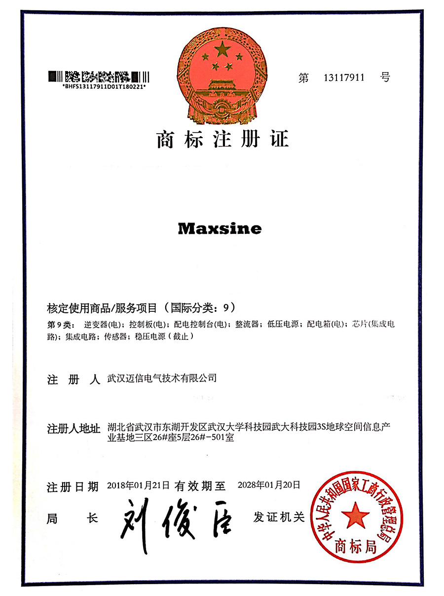2018年1月21日,武漢邁信電氣技術(shù)有限公司Maxsine®英文商標(biāo)正式注冊(cè)。