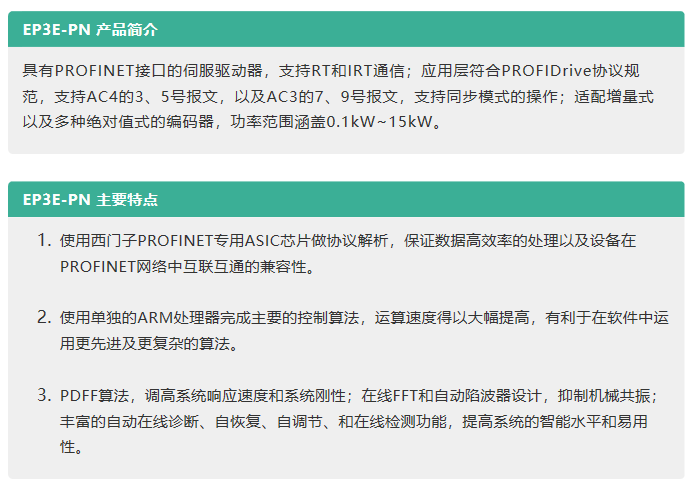 同時(shí),作為國內(nèi)首家成功研發(fā)出PROFINET伺服并支持PROFIDrive行規(guī)的伺服廠商,我們將為用戶帶來集穩(wěn)定可靠與高性價(jià)比于一身的EP3E-PN PROFINET總線伺服系統(tǒng)。