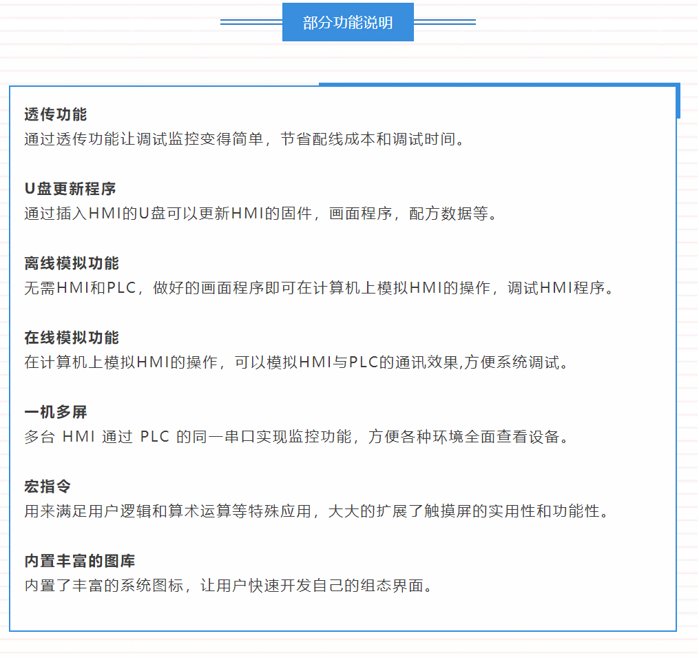 配方通俗的講就是一組數(shù)據(jù)的集合,是指保存在 HMI 內(nèi)部一組連續(xù)的寄存器中的數(shù)據(jù),該區(qū)域中的數(shù)據(jù)是可掉電保存的。使用時(shí),通過選擇不同的配方索引組別,可將該組數(shù)據(jù)快速下載到控制器中使用,比如:你的生產(chǎn)線需要生產(chǎn)100 種商品,那么輸入這些商品的參數(shù)將是一個(gè)很耗時(shí)的工作。加入這些數(shù)據(jù)被事先輸入到配方中,那么當(dāng)你更換需要生產(chǎn)的產(chǎn)品種類時(shí),只需要更改配方號(hào)即可,而無需去實(shí)時(shí)的輸入數(shù)據(jù),這樣做的另外一個(gè)好處就是數(shù)據(jù)在現(xiàn)場(chǎng)對(duì)于操作人員來說是不可見的,從而保護(hù)了你的數(shù)據(jù)安全,讓生產(chǎn)變得更加簡(jiǎn)單。