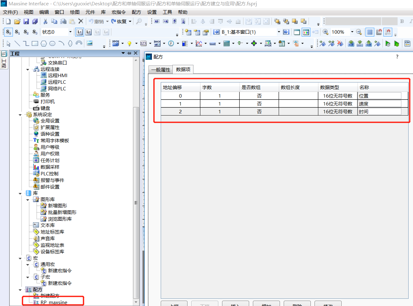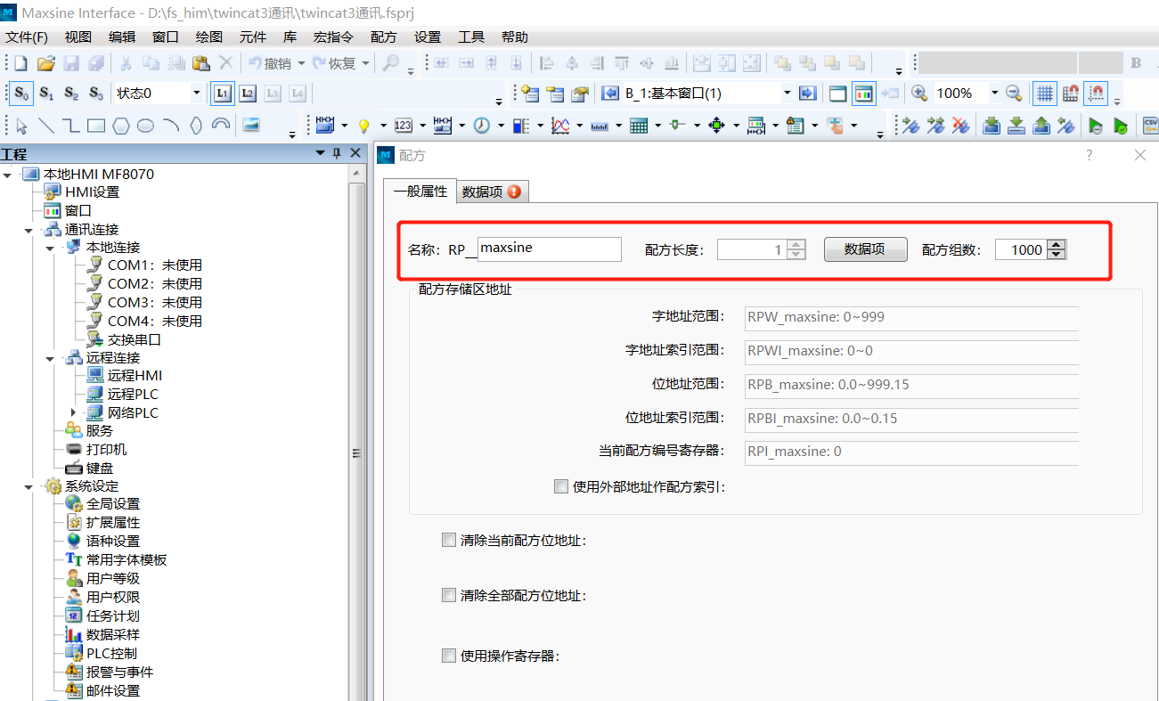 由上圖可以看出,點(diǎn)擊“新建配方”后,在“名稱”欄后會(huì)有一個(gè)輸入框,在此處輸入的“名稱”就是該新建配方的寄存器名稱。該名稱可以是中文、數(shù)字、字母等,其中前面的“RP_”為固定內(nèi)容,表示是“配方寄存器”。譬如,我們?cè)诿Q框內(nèi)輸入“maxisne”,那么軟件的配方條目中,會(huì)增加一“RP_maxsine”的條目,且其使用的寄存器名稱也是“RPW_maxsine”,即“RP_ maxsine”名稱的配方所使用的字寄存器。