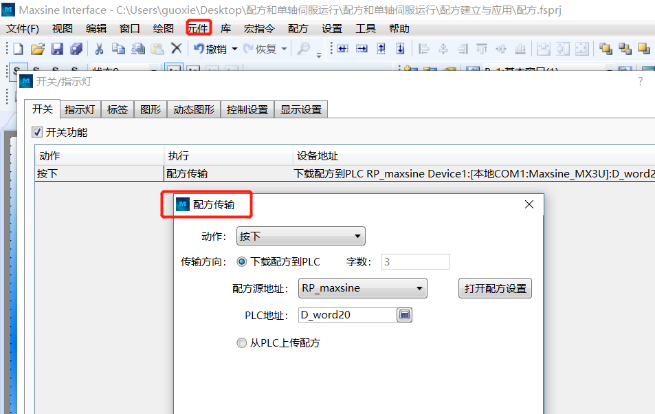 3.1 點(diǎn)擊“元件→開關(guān)→配方傳輸”出現(xiàn)下列窗口,設(shè)置配方源地址,下載至PLC起始地址D20,確認(rèn),完成配方下載功能按鈕。