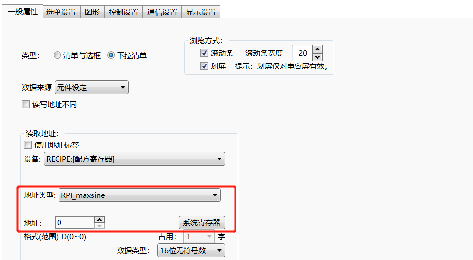 此為可選項(xiàng),默認(rèn)不勾選。當(dāng)勾選此項(xiàng)后,可以定義一個(gè)自定義的字地址,作為配方索引寄存器,這樣前面的“當(dāng)前配方編號(hào)寄存器”就不在起作用, 譬如此例的說明中,如果勾選了該選項(xiàng)“RPI_maxsine:0”這個(gè)寄存器就不再作為“RP_maxsine”這個(gè)配方的索引地址了。