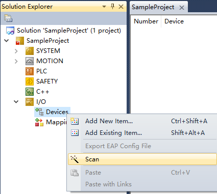 在配置模式下,點(diǎn)擊左側(cè)工程欄內(nèi)IO,右鍵Devices,點(diǎn)擊Scan,
