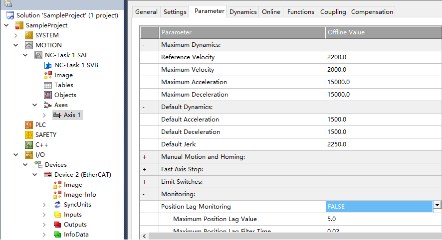 點(diǎn)擊左側(cè)工程欄中MOTION→Axes→Axis1,將Parameter窗口中的Monitoring下Position Lag Monitoring 改為false(關(guān)掉跟隨誤差監(jiān)視);