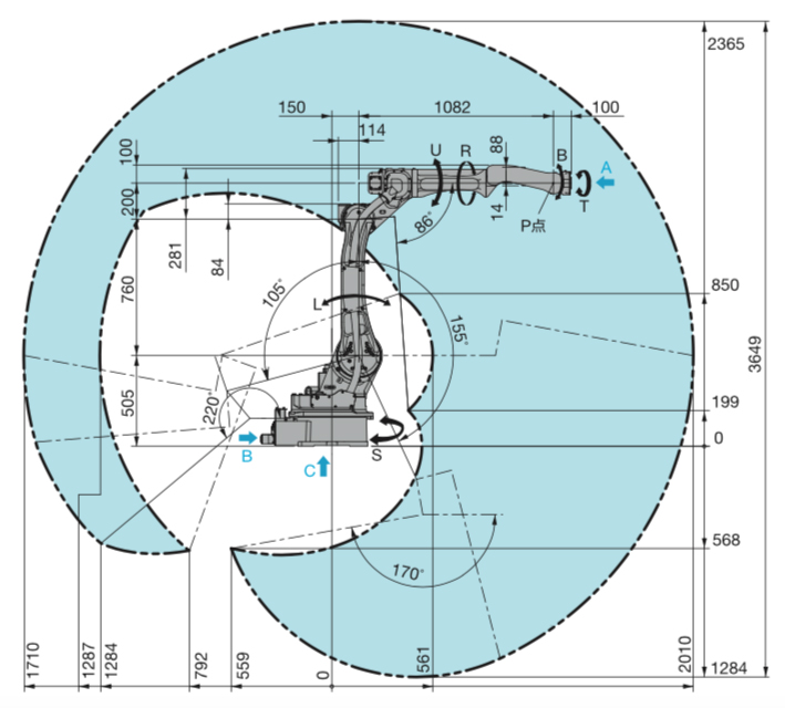 每一臺(tái)工業(yè)機(jī)器人都有最大的運(yùn)動(dòng)范圍和可以到達(dá)最遠(yuǎn)的距離,這時(shí)候就需要考慮它的運(yùn)動(dòng)范圍是不是符合自己的需求。