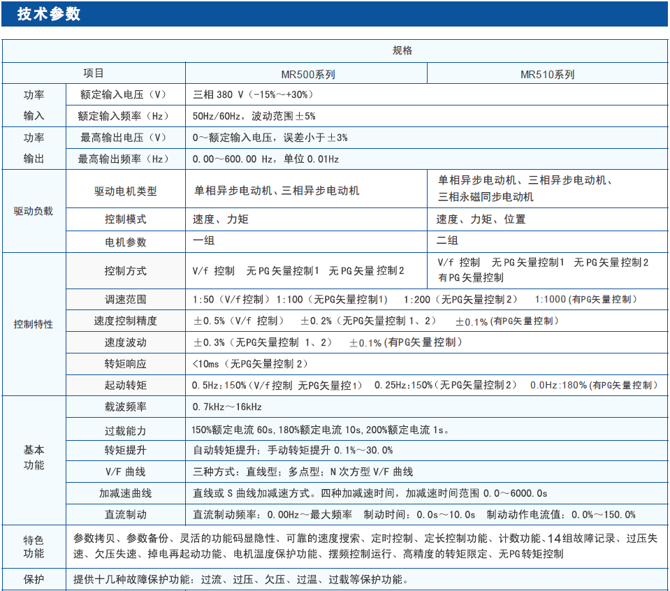 MR500系列是邁信電氣新一代的變頻器主力機(jī)型,高性能、高品質(zhì)、高功率密度設(shè)計(jì)。主要定位為中高端市場的OEM客戶及特定的風(fēng)機(jī)、水泵類負(fù)載應(yīng)用場合,其設(shè)計(jì)靈活,內(nèi)嵌SVC、VF控制與一身,可廣泛應(yīng)用于對(duì)速度控制精度、轉(zhuǎn)矩響應(yīng)速度、低頻輸出特性有較高要求的應(yīng)用場合。