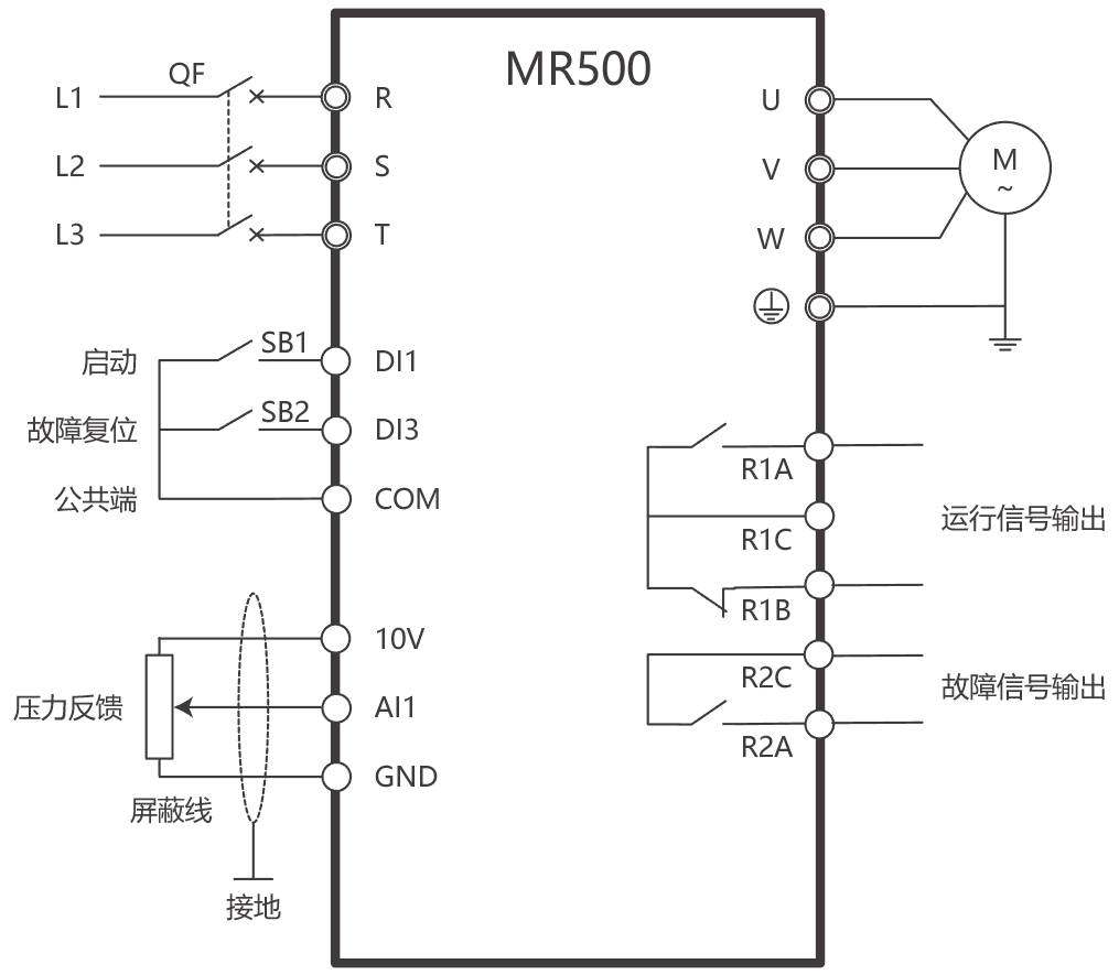 在主要功能預(yù)置方面,最高頻率應(yīng)以電動(dòng)機(jī)的額定頻率為變頻器的最高工作頻率。升、降速時(shí)間在采用變頻器內(nèi)置PID調(diào)節(jié)。升、降速時(shí)間應(yīng)盡量設(shè)定得短一些,以免影響由PID調(diào)節(jié)器決定的動(dòng)態(tài)響應(yīng)過程。控制原理如下: